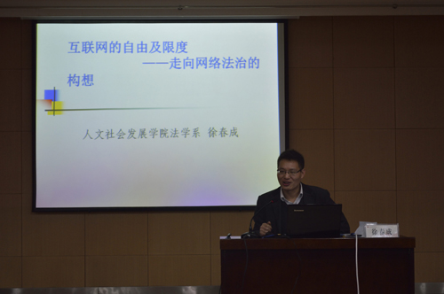 讲座中,徐春成老师以“依法治国”开题,并引申到“依法治网”,对讲座题目的涵义进行了解释,提出了“什么是网络”的疑问,对互联网的表象与内涵作了深刻论述。他指出,互联网极大扩展了言论自由、通讯自由和获取信息自由,有着巨大的社会价值。但是,互联网还存在信息造假、版权侵犯及人格诽谤等诸多潜在的负面影响。