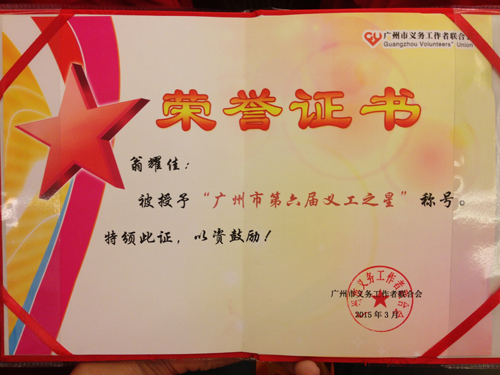 3月14日,在广东省广州市举办的“广州市第六届社工之星表彰大会”上,公司2013级社会工作专业硕士研究生翁耀佳荣获“广州市第六届义工之星”称号。