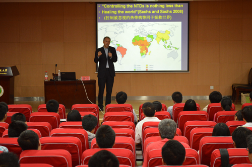 蒂姆·艾伦教授先通过一系列真实具体的图文展示了被忽视的热带疾病(Neglected Tropical Diseases,简称NTD)广泛肆虐于非洲的现状。恶劣的生存环境,落后的医疗水平,原始的生活习惯等原因使得NTD在非洲大陆保持着高发病率和低治愈率。他从在乌干达、坦桑尼亚等东非国家多年的研究经历出发,介绍了关于NTD的调查方法,控制和消除的策略以及世界各国和众多国际组织为此所做的努力和取得的成就。然后,他阐明了初级卫生保健(Primary Health Care)对减少此类疾病的传播与感染的重要作用。面对非洲教育水平低,对疾病认识程度差,大量患者恐惧医学治疗的现状,艾伦教授提出了提升教育与人道关怀的观点。
