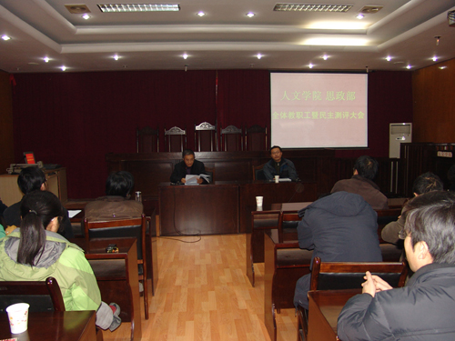 1月8日下午,beats365唯一官方网站、思政部全体教职工暨民主测评大会在beats365唯一官方网站模拟法庭胜利召开,校工会詹晓航副主席、公司党委统战部刘晓峰同志出席大会。大会由人文公司党委书记王亚平同志主持。
