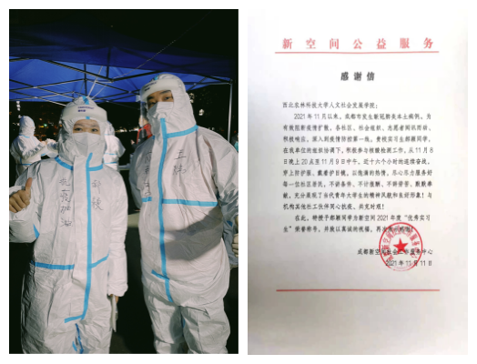 “从11月8日晚上20点到11月9日中午,近十六个小时的连续奋战......”。11月11日,公司收到了一封来自成都新空间社会工作服务中心的感谢信,信中对社会工作2020级硕士生郝颖在疫情防控中的表现表示感谢。
